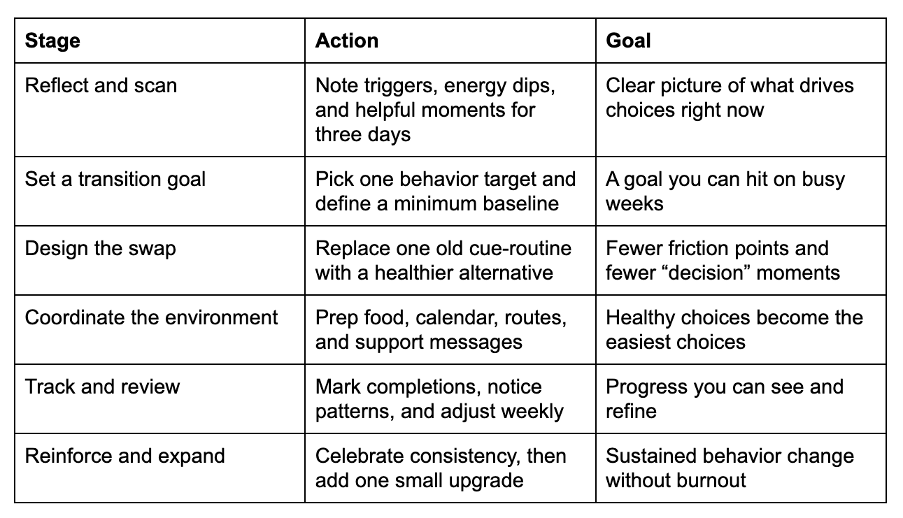 Each stage feeds the next: reflection makes the goal realistic, the swap keeps it doable, and coordination reduces willpower drain. Tracking turns your week into feedback, so reinforcement feels earned and expansion stays gentle.